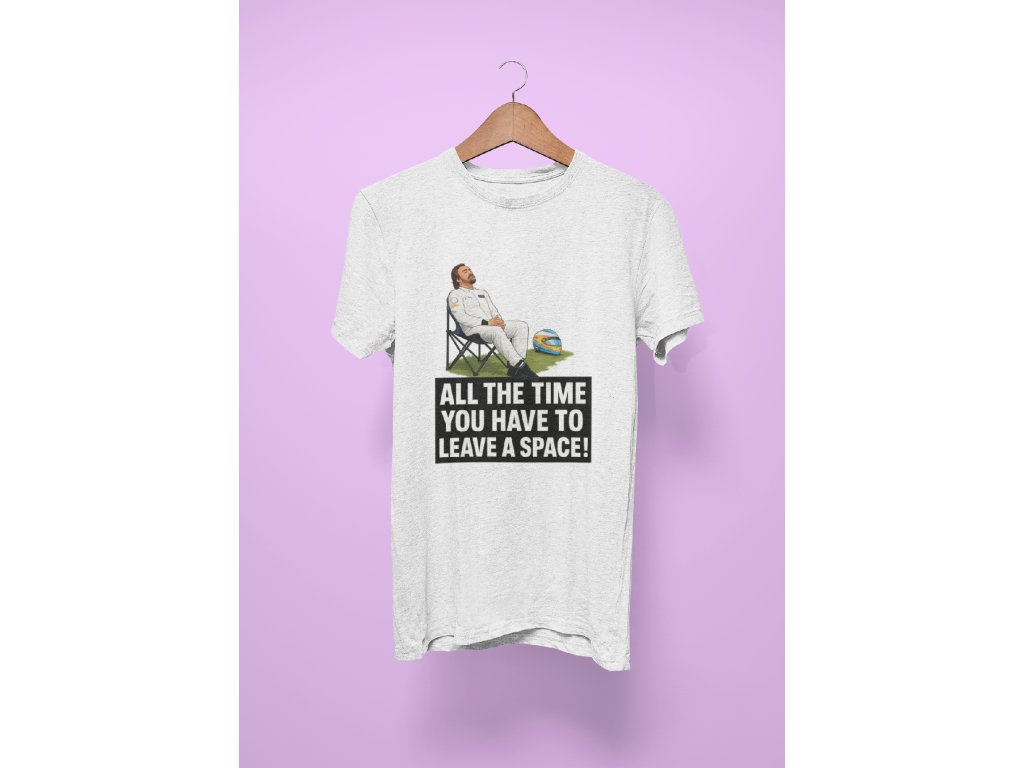 Pořiď si kus historie Formule 1 s naším Fernando Alonso – Leave a Space Tričkem. Legendární hláška z rádia „All the time you have to leave a space!“ doplněná ikonickým memem s Alonsem na skládací židličce dělá z tohoto trička nepostradatelný kousek pro všechny fanoušky.
