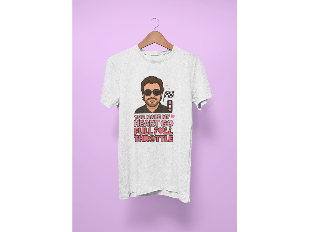 Láska na plný plyn! Tričko s ilustrací Fernanda Alonsa a nápisem “You make my heart go full throttle” je ideální pro všechny fanoušky F1, kteří chtějí ukázat vášeň nejen k motorsportu, ale i špetku humoru a romantiky. Skvělé jako dárek pro partnera/partnerku nebo must-have do šatníku každého Alonso fanouška. ❤️🏁
